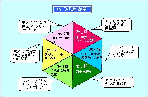 食品にはそれぞれ異なった働きがあります。下の「6つの基礎食品」の表を見てください。これは、食品の働きを主に6つに分けたものです。