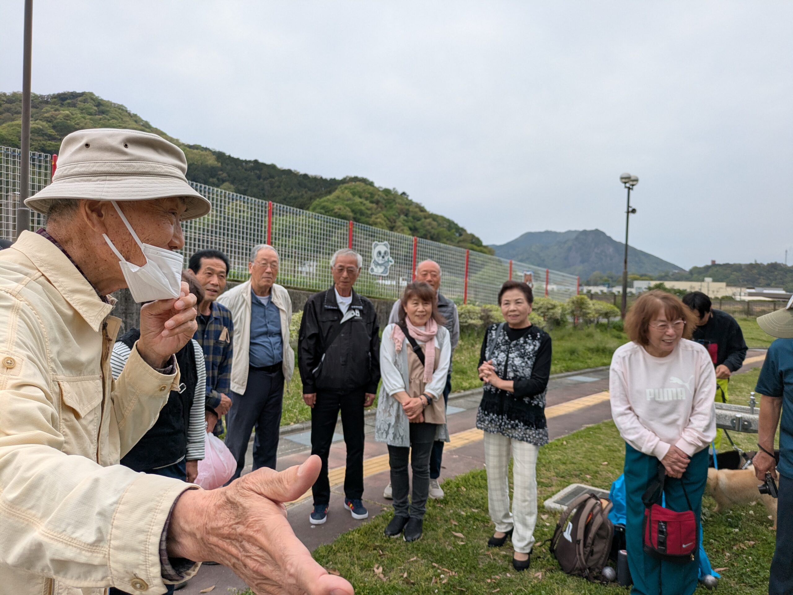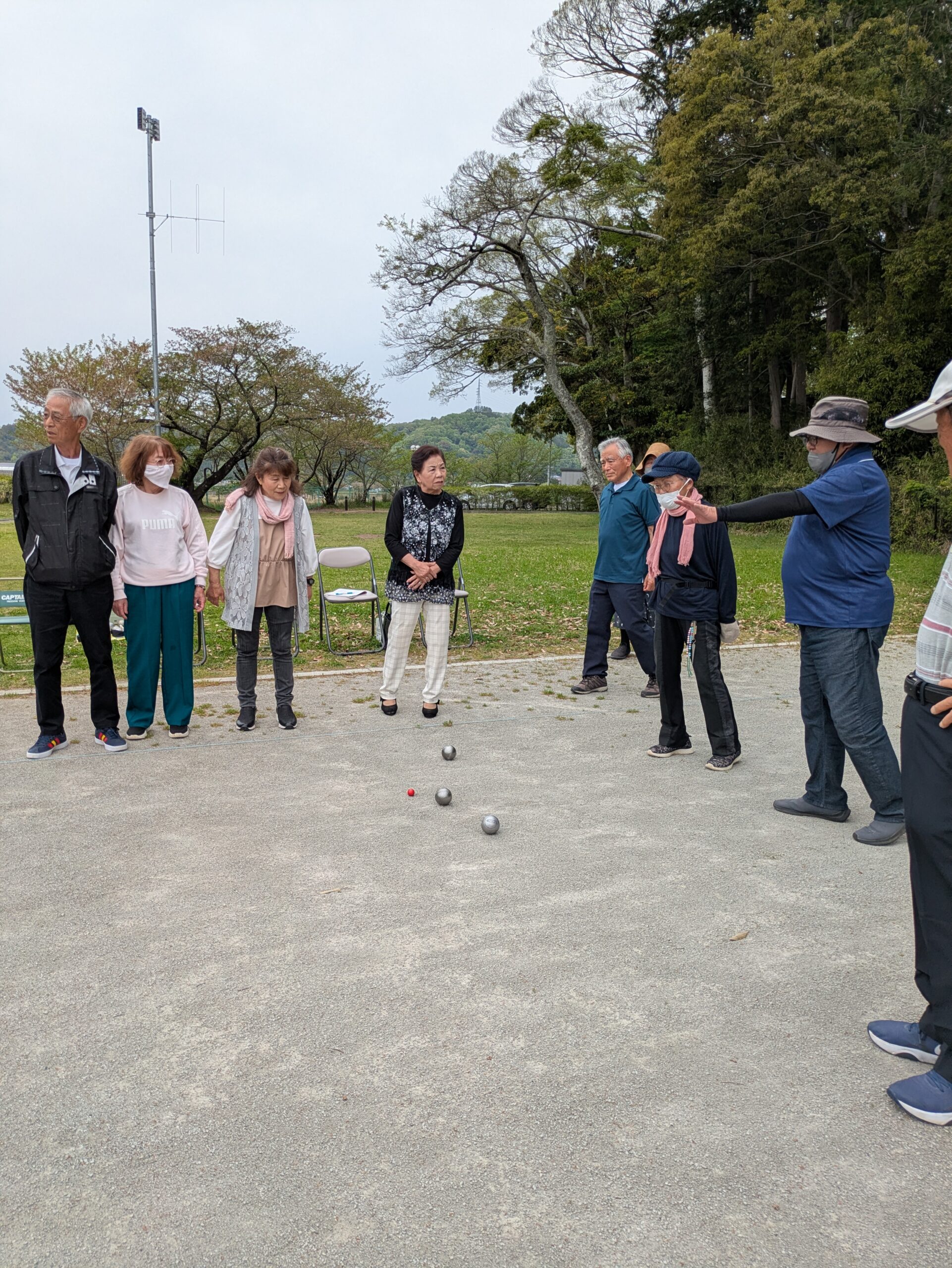 ペタンクの鉄球を手にする菊川の皆さん
