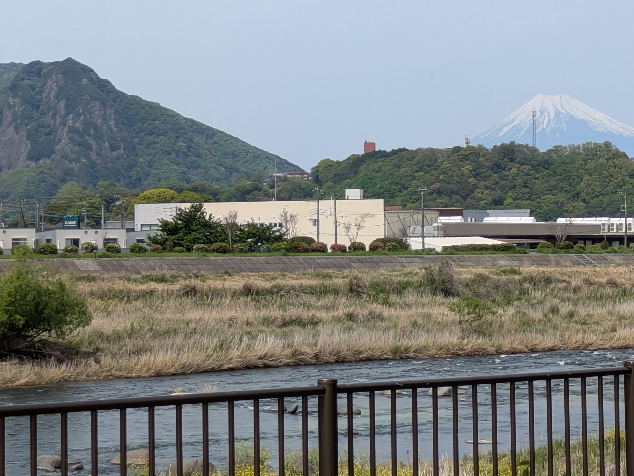 ペタンク練習場「さくら堤公園」から見える、狩野川と城山と富士山