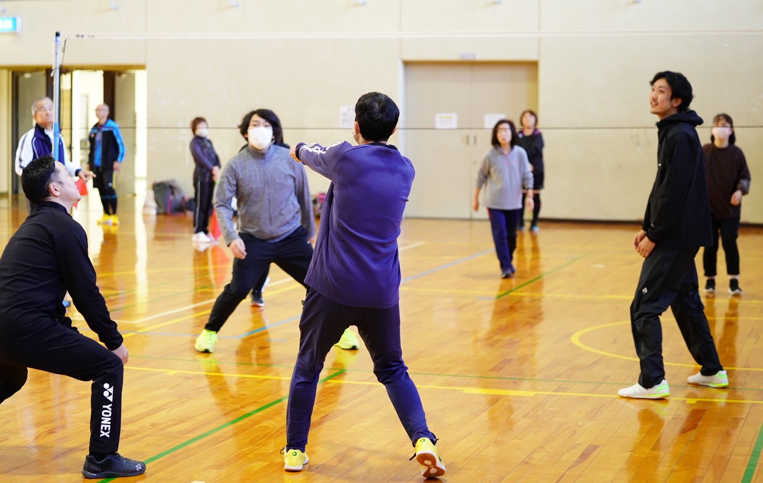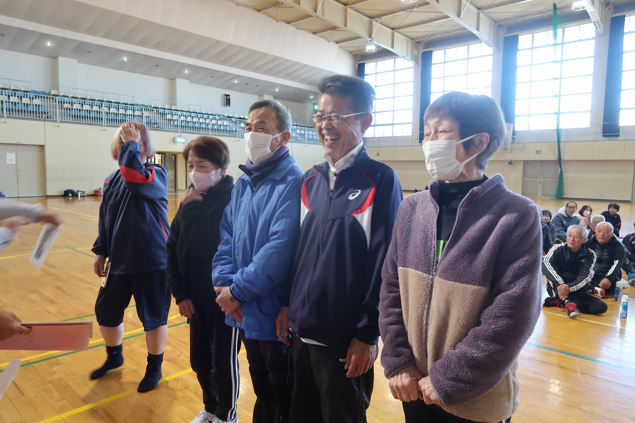 本交流会には小谷村から2チーム、浜松市から2チーム、静岡市から1チーム、袋井市から1チーム、菊川市から12チーム計18チーム88人が参加し、3チーム✖6コートで楽しく体を動かしました。