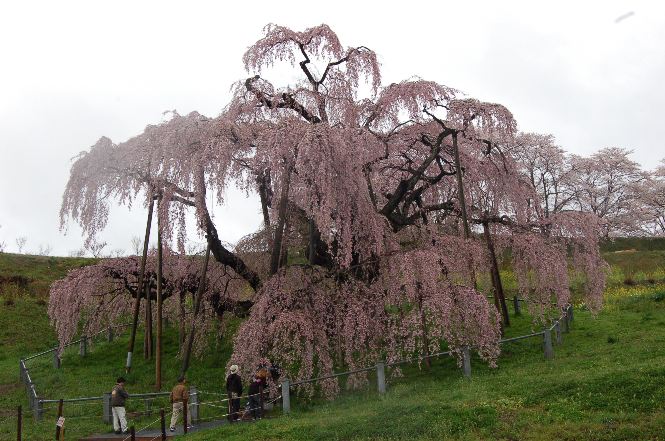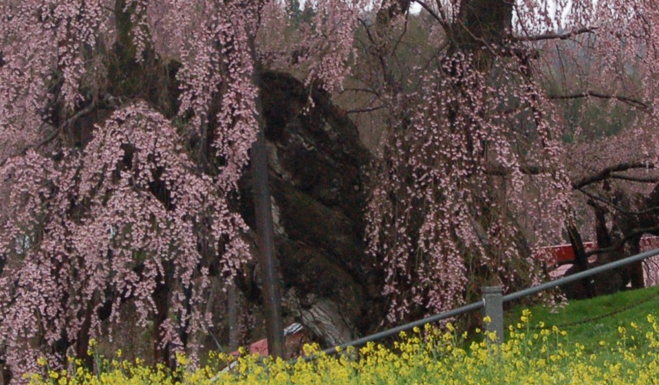 福島県三春町 三春の滝桜 推定樹齢は一千年とされるベニシダレザクラです。樹高13.5メートルの巨木から薄紅色の花が滝のように咲き誇ります。